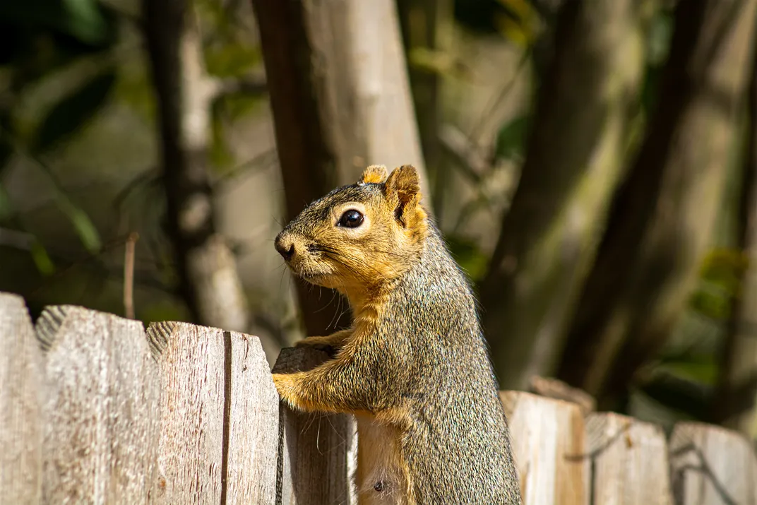 A curious squirrel pauses on the backyard fence, looking directly into the camera. Taken with a telephoto lens, the shot captures the details of its fur and expressive eyes, providing an intimate portrait of suburban wildlife.