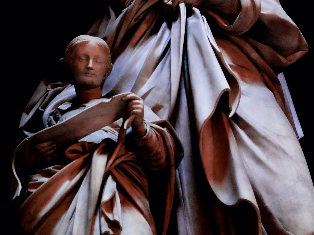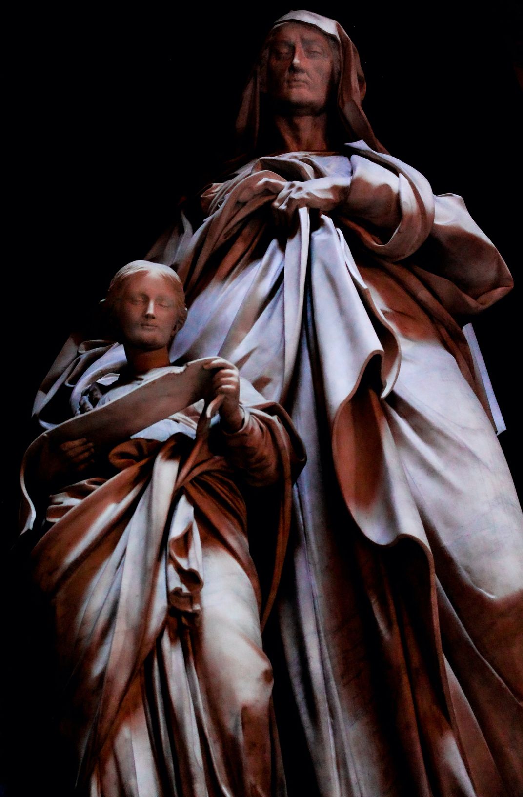 The Pantheon is a former Roman temple, and now a Catholic church. On the interior of the Pantheon (Rome, Italy), sculptures are displayed in niches in the walls. These statues were created by Il Lorenzone, and depicts St. Anne, who is believed to be the woman chosen by God to be the mother of the Virgin Marry.