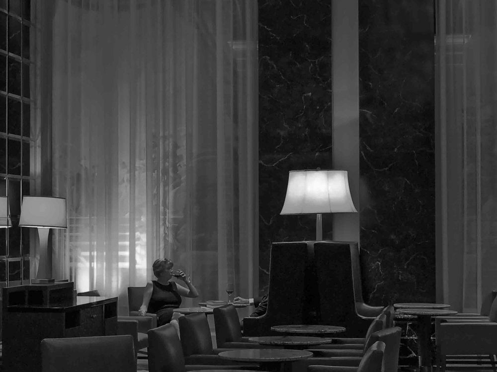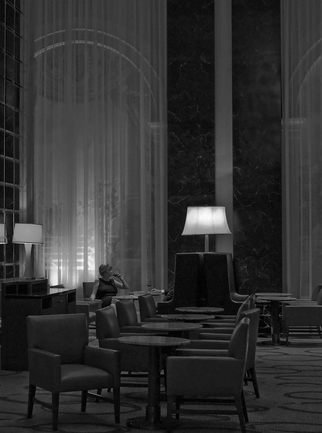 Photographed inside San Francisco’s historic St. Francis Hotel, this image captures a quiet moment suspended in cinematic light. The woman’s gesture, the layered glow of lamps, and the rhythm of empty chairs evoke the stillness that lingers between encounters — a study in solitude amid grandeur.