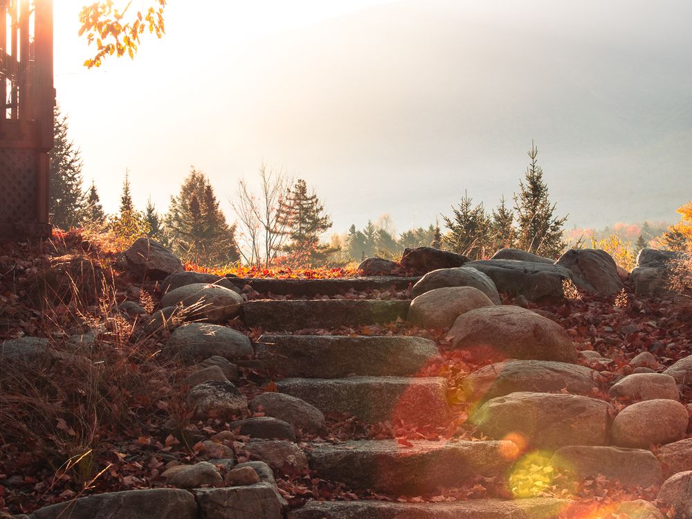 A stone path leading toward the mountains, covered in fallen leaves. The sunrise poured through the trees, filling the scene with warmth and natural sun flare — a quiet, peaceful moment that felt like walking straight into a perfect fall morning in the White Mountains.