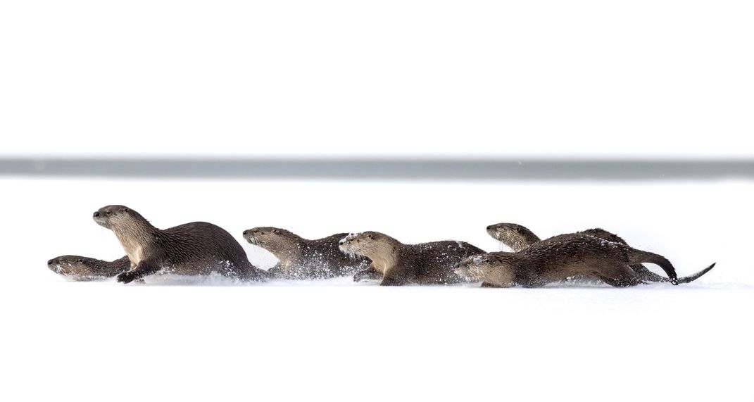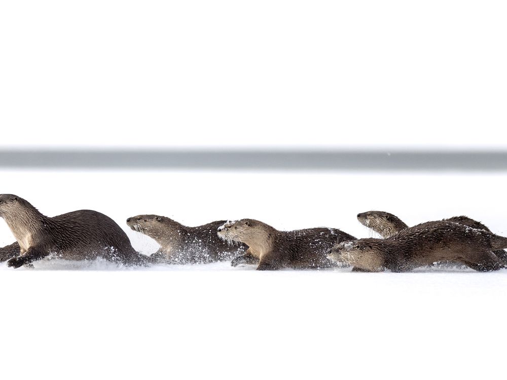 A family of otters stampede along the shores of an almost frozen river, kicking up snow. The four pups are approaching their first birthdays, and will soon be off on their own - but until then, this big happy family will play and fish together.