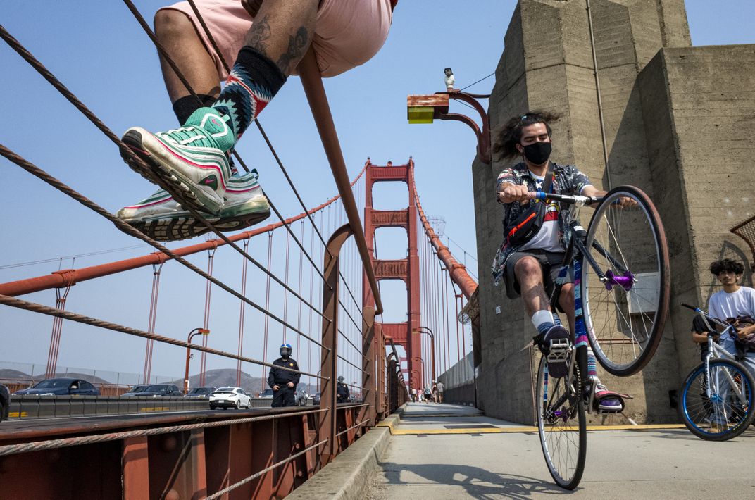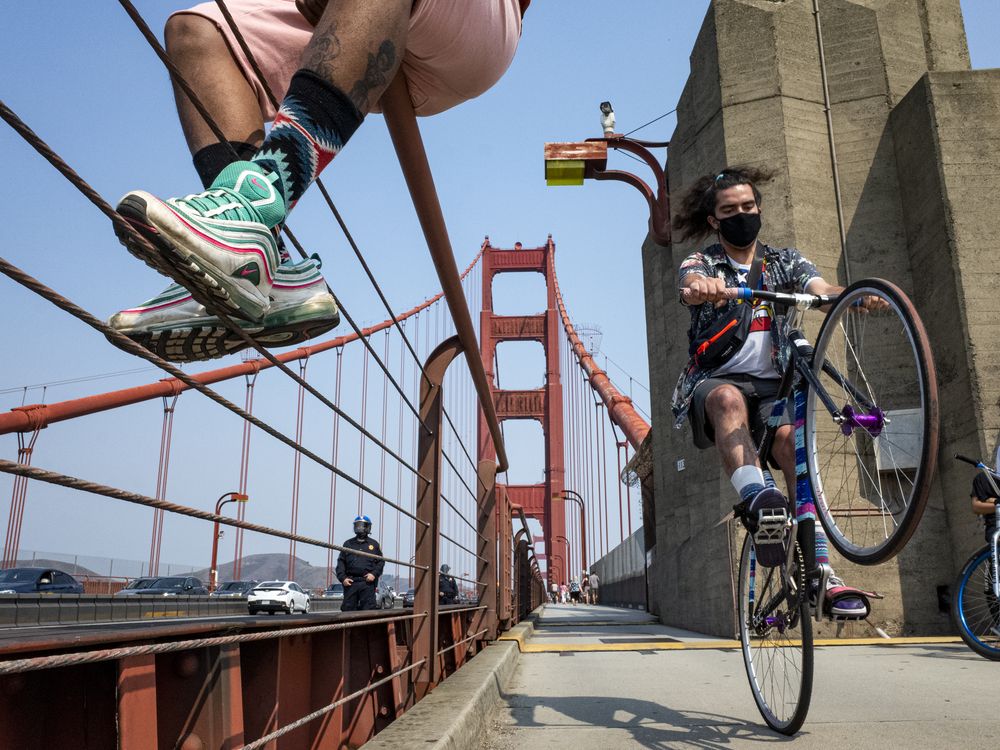 Protestors walk and bike along the Golden Gate Bridge in San Francisco, CA protesting police violence and the murder of George Floyd.