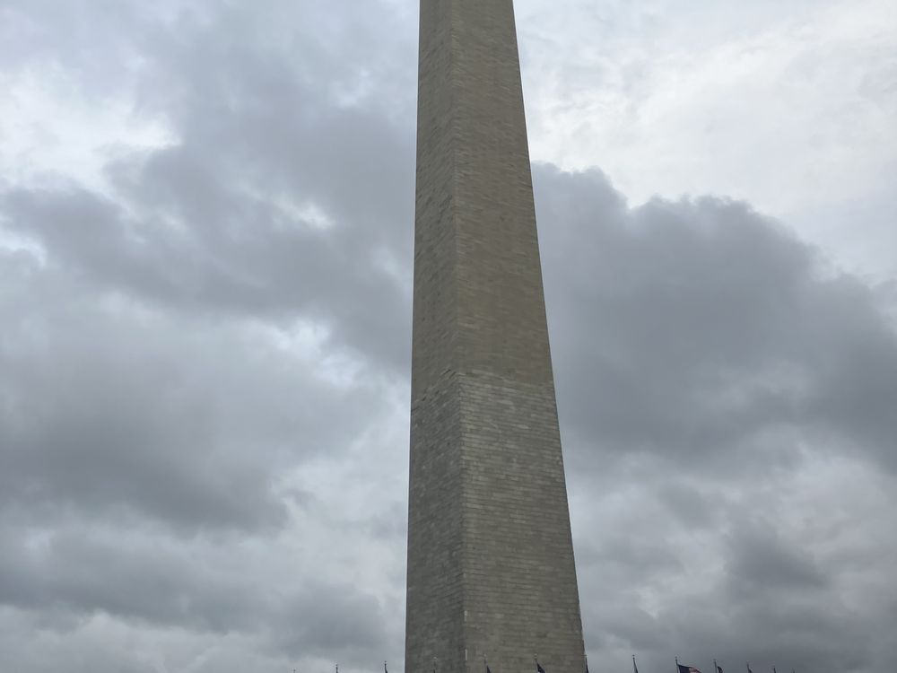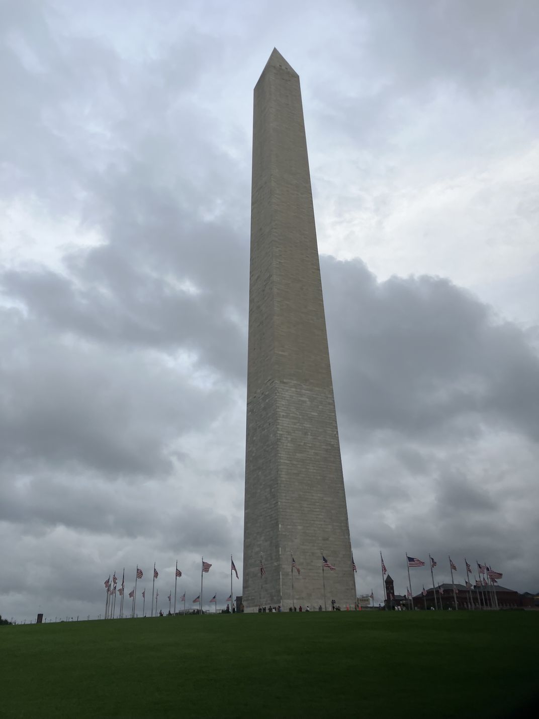 The Washington Monument stands tall against a stormy sky, flanked by American flags.