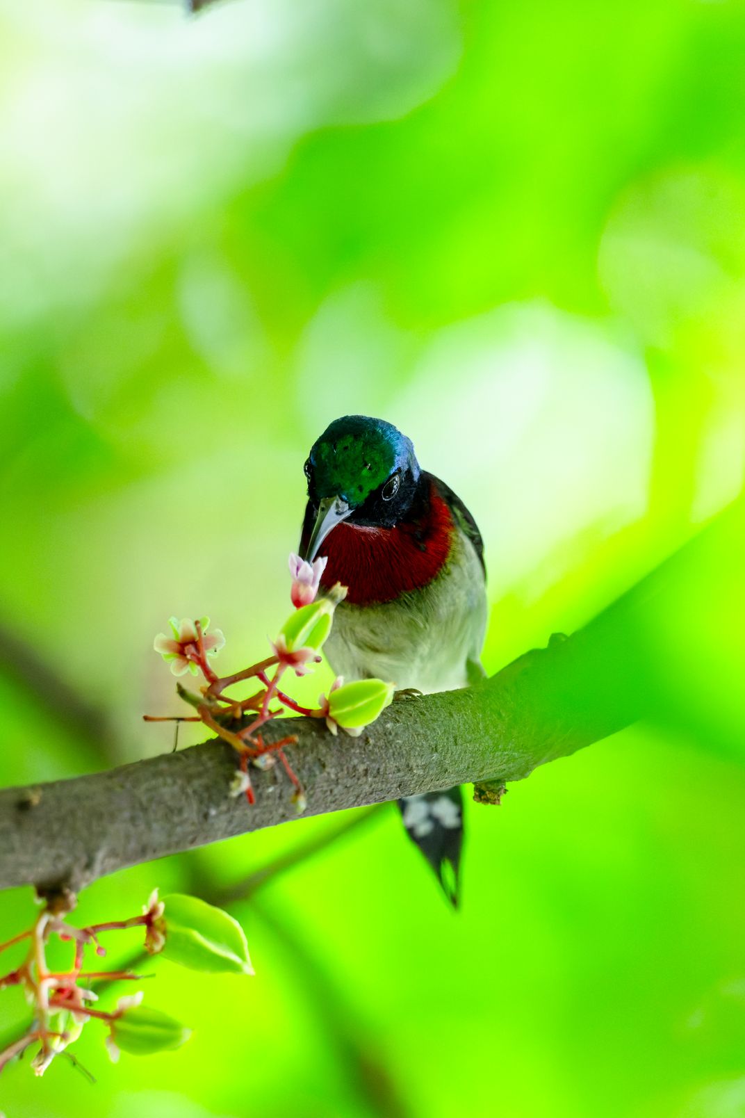 A vibrant, jewel-toned Sunbird delicately sips nectar from the blossom of a Star Fruit tree (Averrhoa carambola) in Tao Dan Park, HCMC. This scene is particularly meaningful in Vietnamese culture, as the Star Fruit is often celebrated in poetry as a symbol of hometown and enduring love. The bird's iridescent blue-green head and crimson chest are framed against the tree's soft, luminous green foliage, creating a perfect study in tropical color and urban wildlife patience.