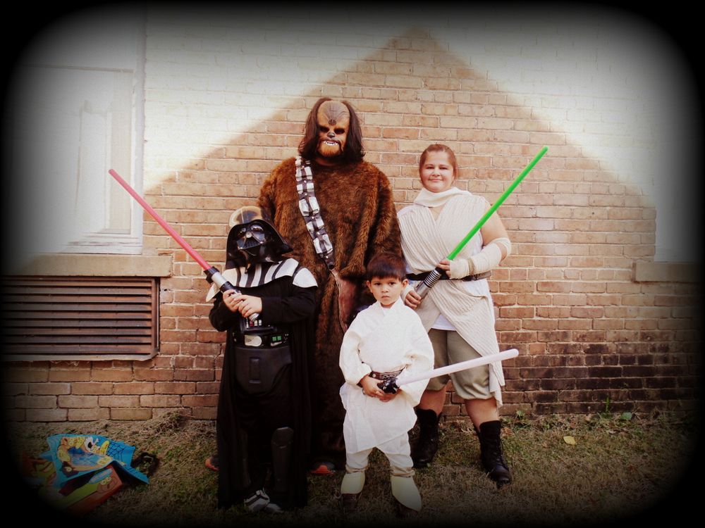 A family cosplaying Star Wars characters. Darth Vader, Chewbacca, Luke Skywalker, and Rey. We are a big Star Wars family, watching all the movies, doing marathons, collecting pop vinyls, figures, and clothing. We love Star Wars.