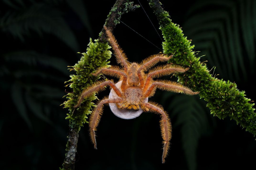 In the lush, biodiverse landscapes of tropical rainforests, a David Bowie spider is spotted perched on a moss-covered branch, gently cradling an egg sack. The egg sack, a glistening sphere resembling a miniature crystal globe, dangles securely from a silken thread beneath its abdomen. David Bowie spider guards its precious cargo, it embodies the spirit of protection and nurture.