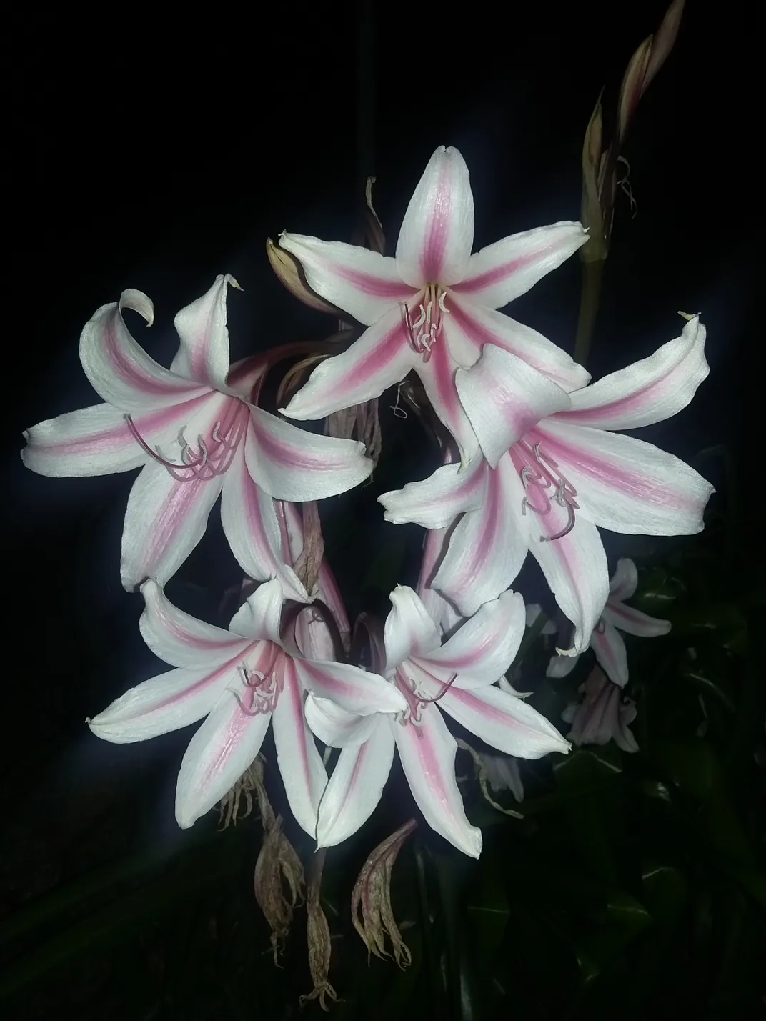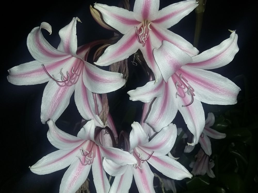 These stargazer lilies grow in my front yard and tend to bloom at night.