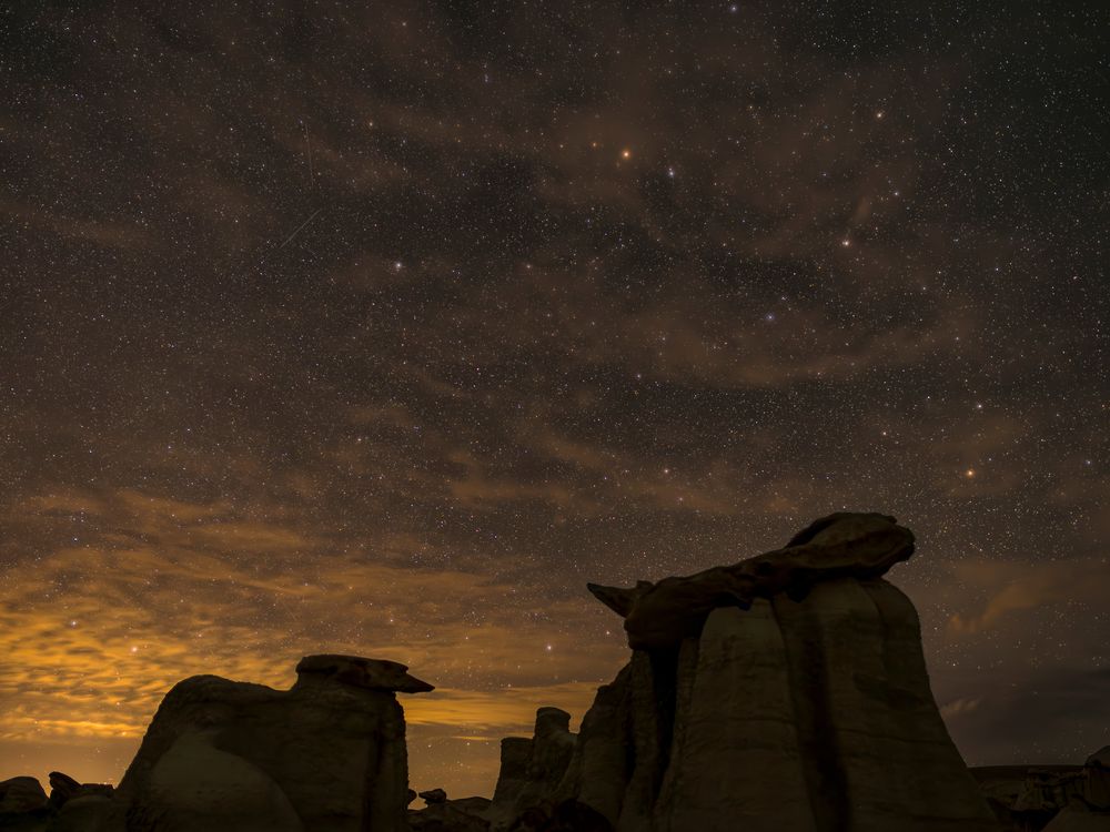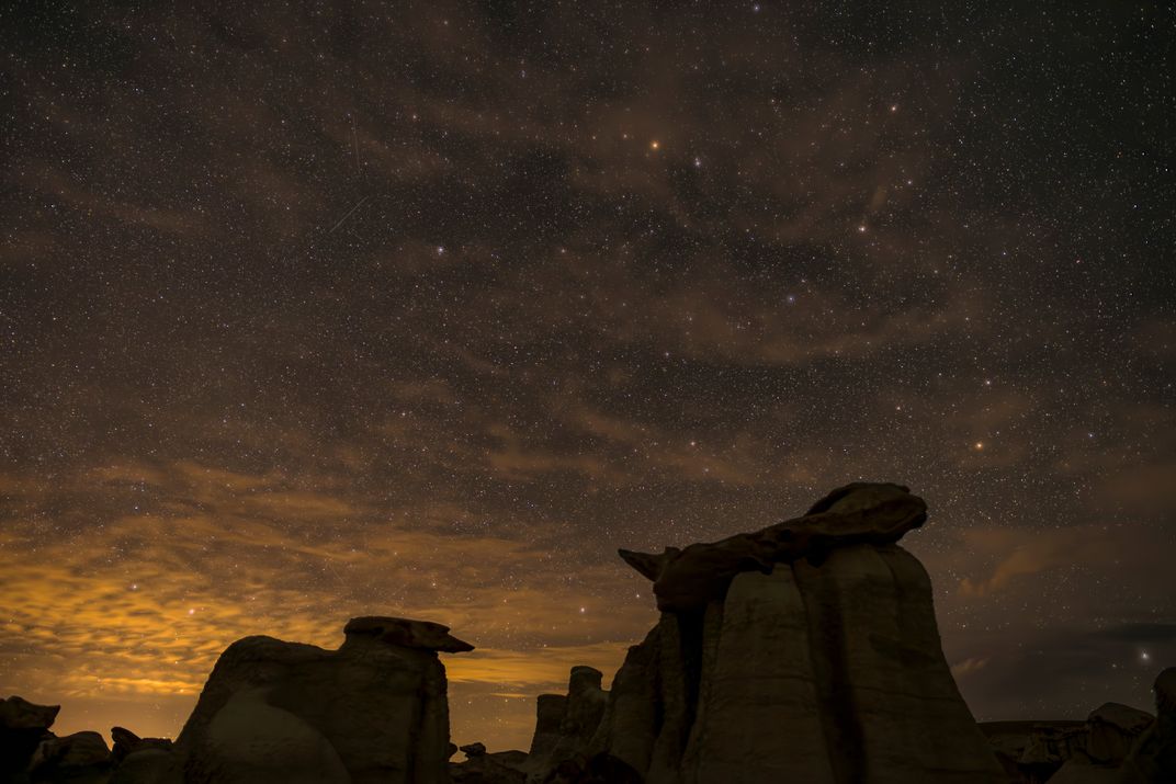 The last remnants of sun fade from the sky above the Valley of Dreams, New Mexico, and stars illuminate the darkened sky. The Valley of Dreams’ towering hoodoo stone structures stand firm in the foreground.