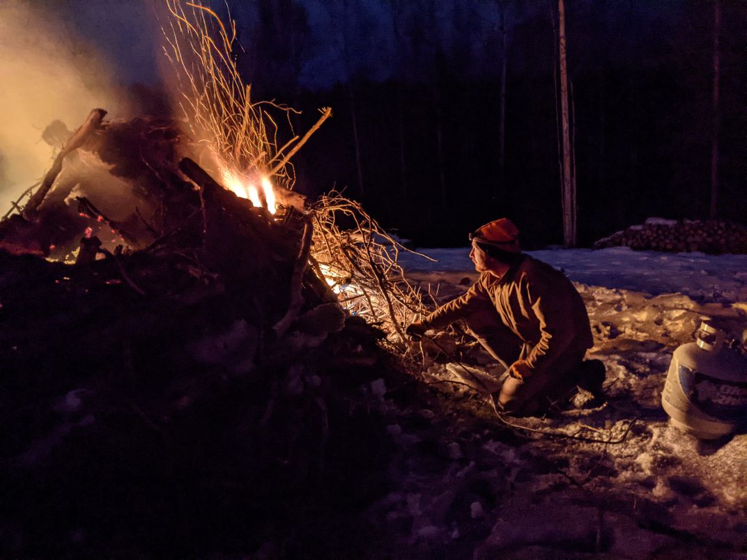 A farmer lights a brush & debris pile left from clearing land to start a farm near Fairbanks, Alaska.