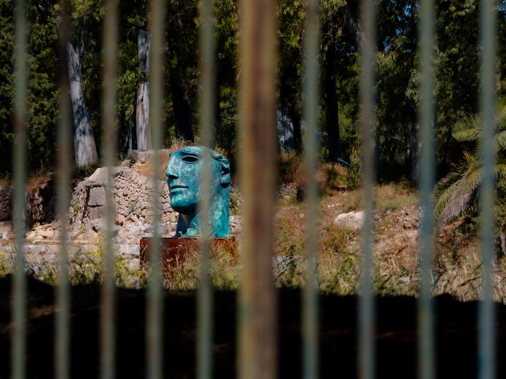 This photograph captures a sculpture by Igor Mitoraj, placed within the natural setting of the ancient Greek Theater of Siracusa, Sicily. Shot from outside the fenced perimeter, the image frames the human head through vertical metal bars, creating a visual and conceptual tension. The artificial, human-like form appears isolated, confined within a space that is both public and protected. Surrounded by trees and stone ruins, the sculpture evokes a paradox: a symbol of culture and permanence, yet visually caged in a living, organic landscape. The result is a composition that questions the boundaries between art, nature, and access.