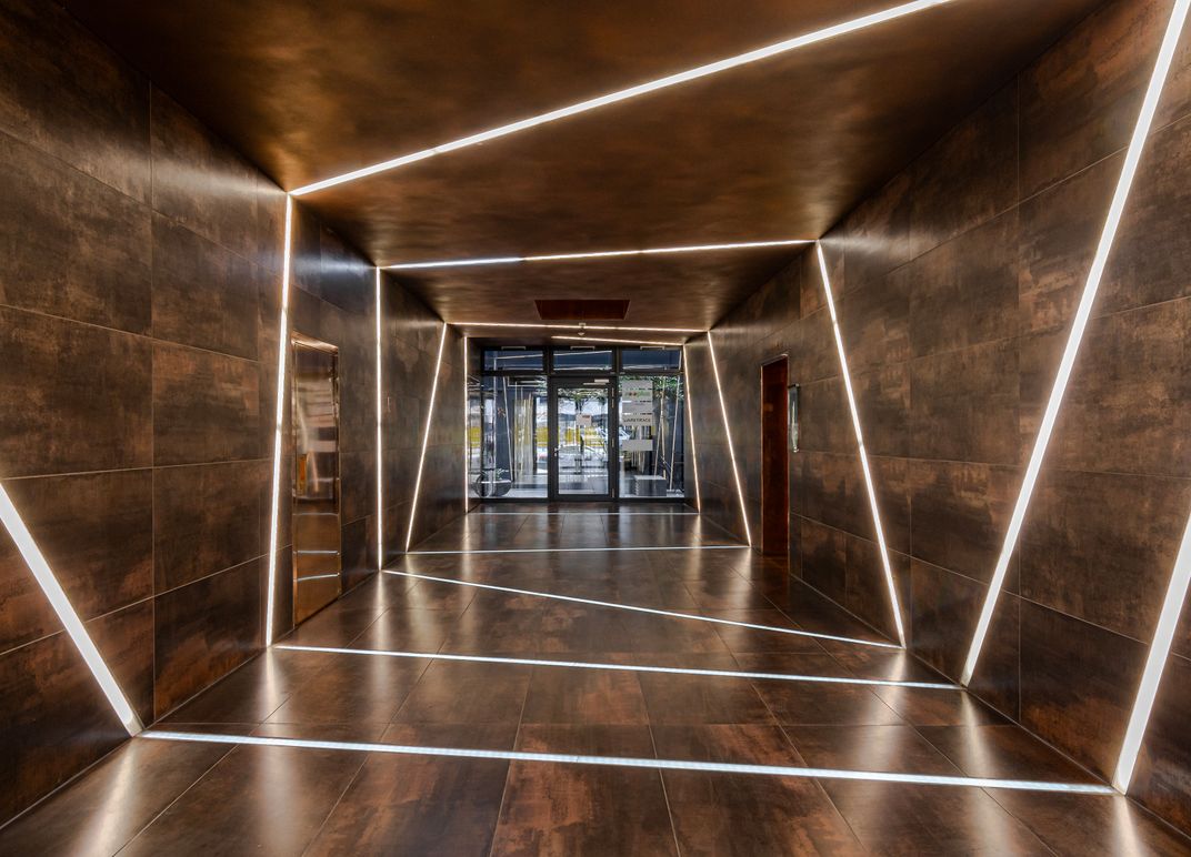 The photo shows architecturally designed passageway of an office building in the center of Munich, Germany.