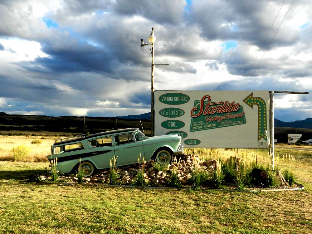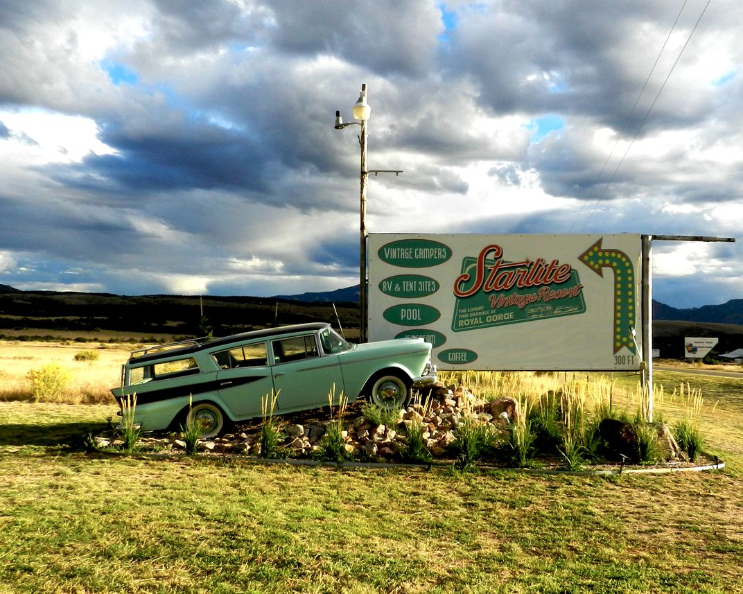A Rambler Cross Country, emblem of the American Dream, stands beside a sign advertising a Retro accommodations campground. The resort displays vintage campers, RV and tent sites and has a pool, blending nostalgic charm with modern comfort.