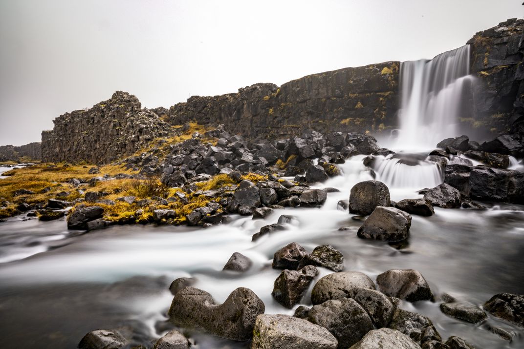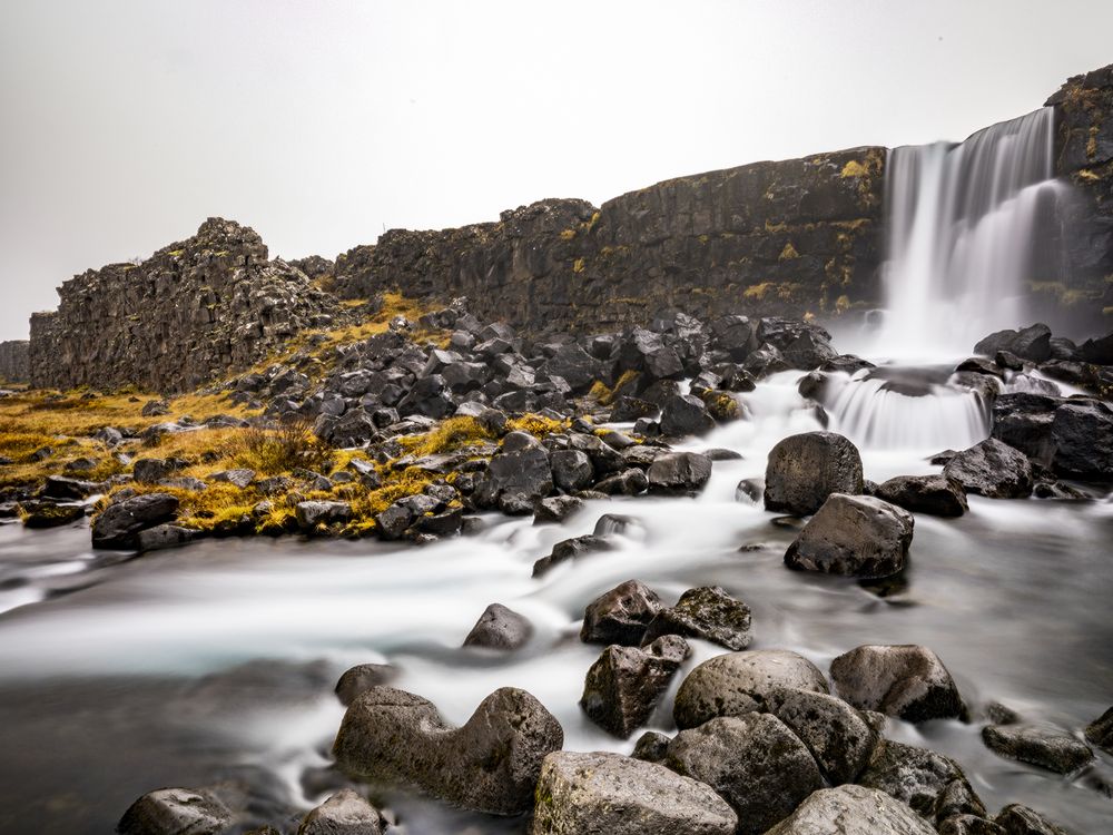 Stepping Stones. This photograph is showing a beautiful waterfall called Öxarárfoss, located in Thingvellir National Park. I wanted to one, capture the yellow moss that encompassed that area, as on top of that hill where the waterfall begins, it's mostly covered in snow! I wanted to capture the aggressive motion of the water and try to reflect the strong flow. I chose to also do a long exposure, to highlight the stark contrast between the rocks and the water.