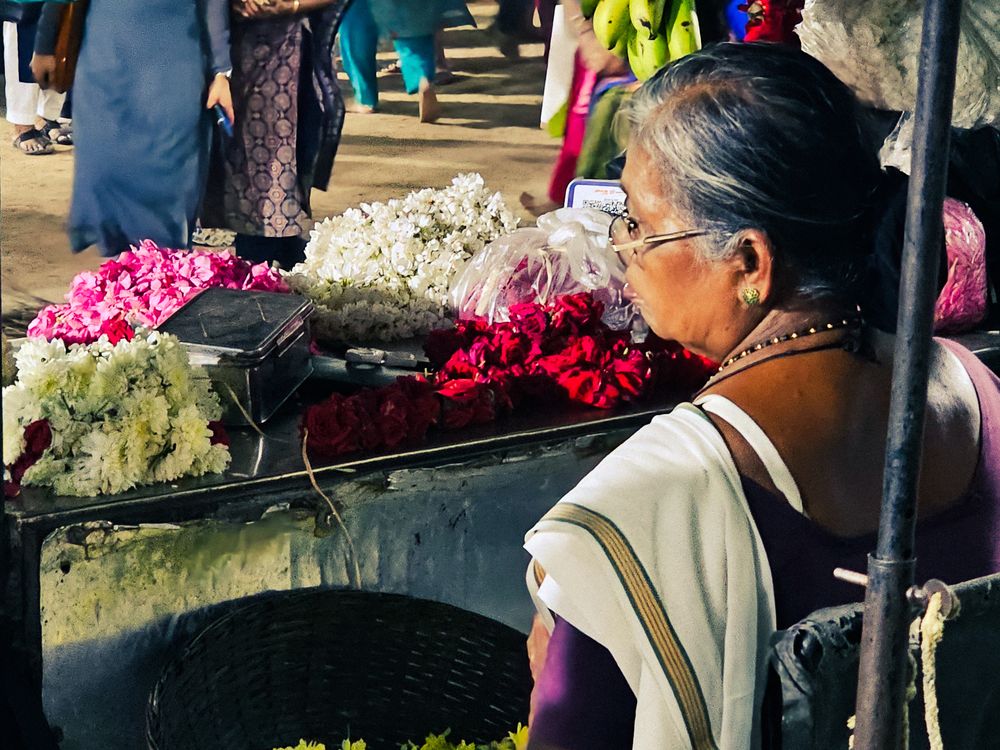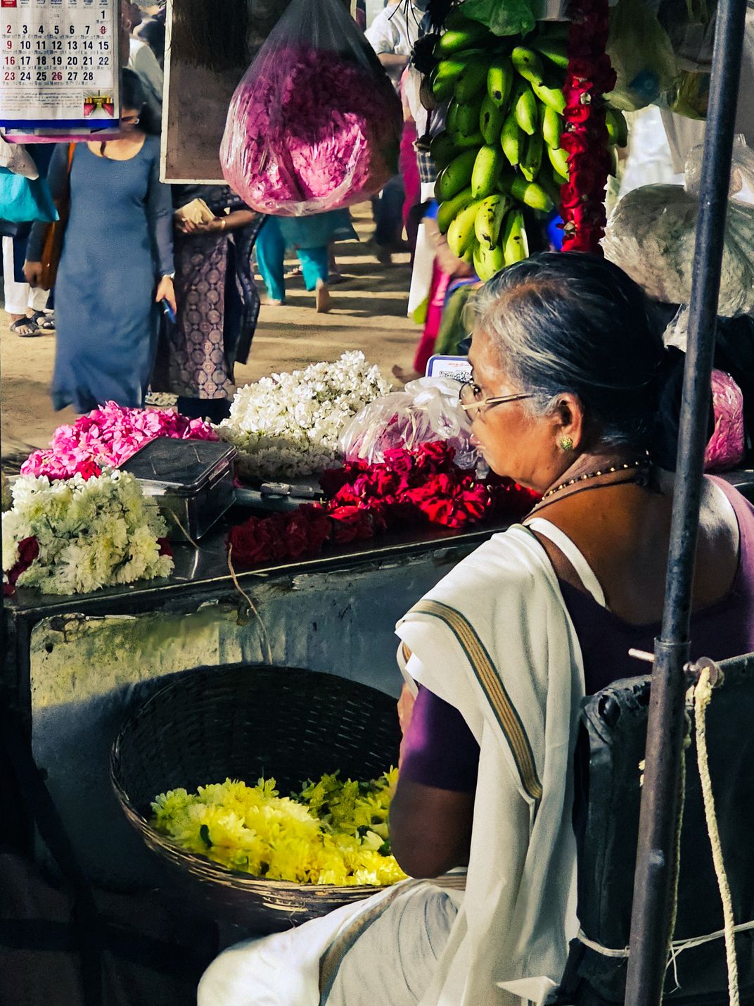 An old flower vendor sitting in still life. Maybe in hope for the next customer or devoured in devotion.