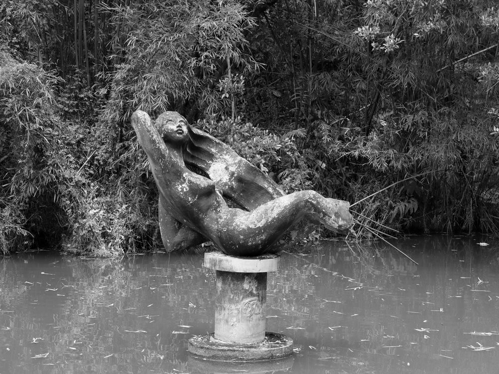 This statue is located in a quiet corner of Liangjinshan Park in Kaiping, China. The exact time of its creation is no longer known. Though weathered by years and surrounded by murky water, it still retains a unique sense of grace and mystery. She lies there silently, waiting for those with a discerning eye to rediscover her forgotten beauty.