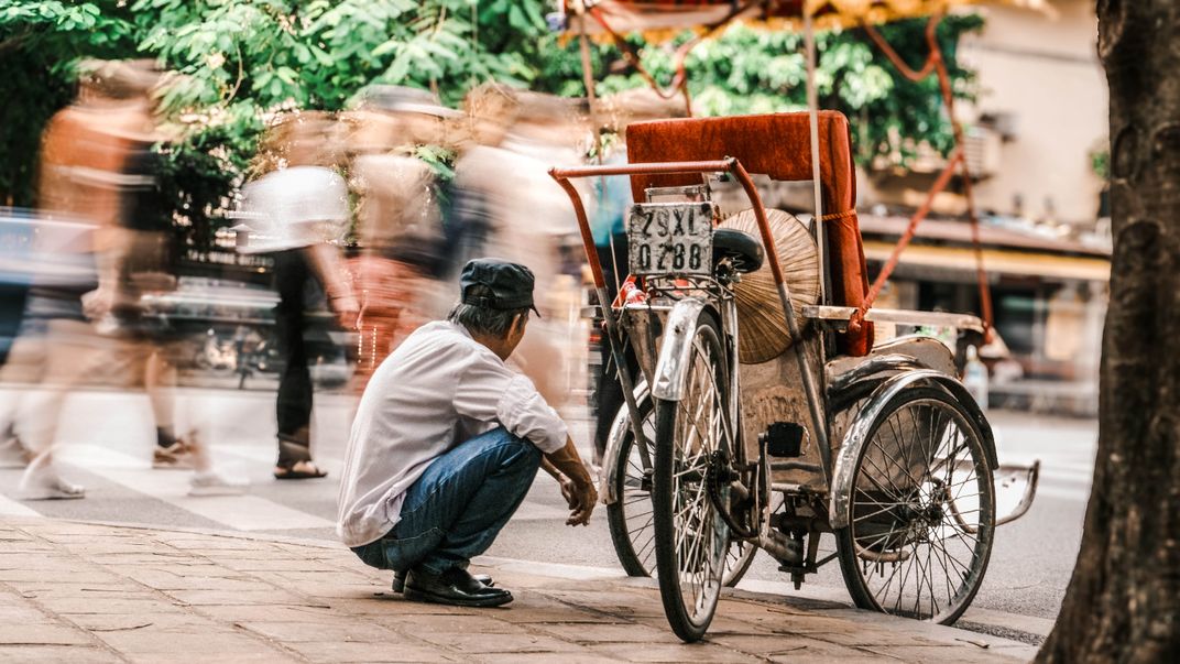 At Văn Miếu—Vietnam's First University—a cyclo driver rests beside his rickshaw as crowds blur past. Old craft against new tempo: a quiet pause waiting for the next fare at the city’s historic gates.