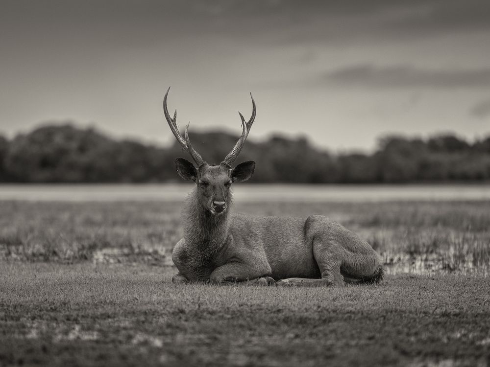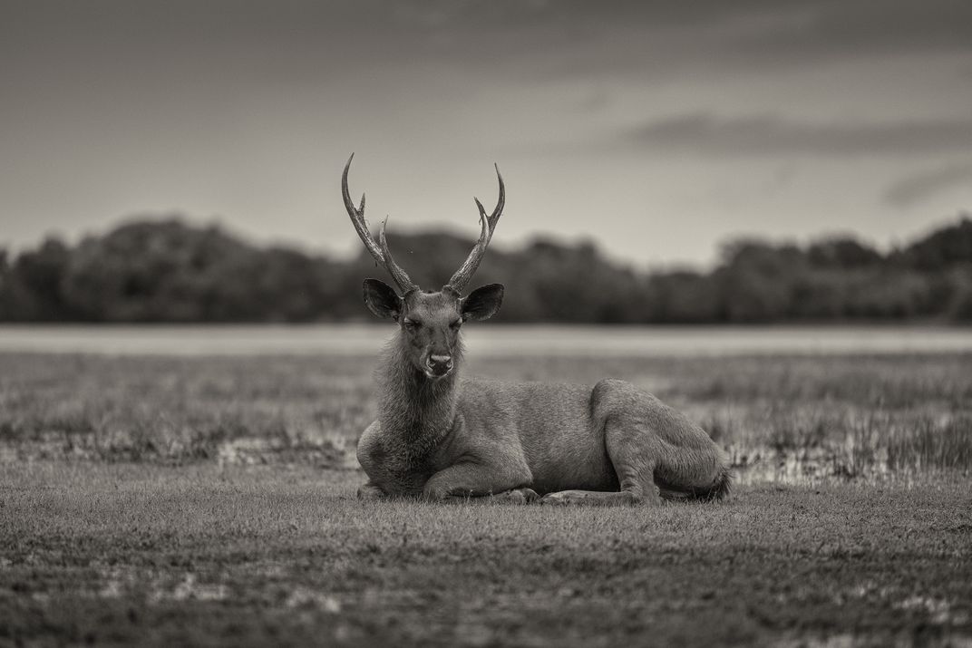 A lone sambar deer rests in the open plains of Kumana, watching the landscape with calm authority. In the quiet hazy midday light, its posture and presence reveal the rare serenity of a park best known for predators and migratory birds.
