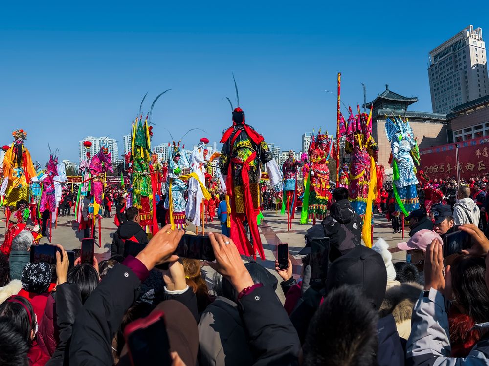 Figures on stilts are draped in colorful robes, feathers shimmering in the sunlight, painting the old city square with vivid, radiant energy.