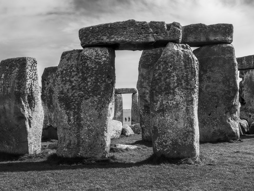 Stonehenge in the United Kingdom. A couple can be seen in the background through a set of stone arches. Stonehenge is a prehistoric megalithic structure, parts of which date back to 3100 BC. The large sarsen stones that comprise most of the composition were placed between 2600 BC and 2400 BC.
