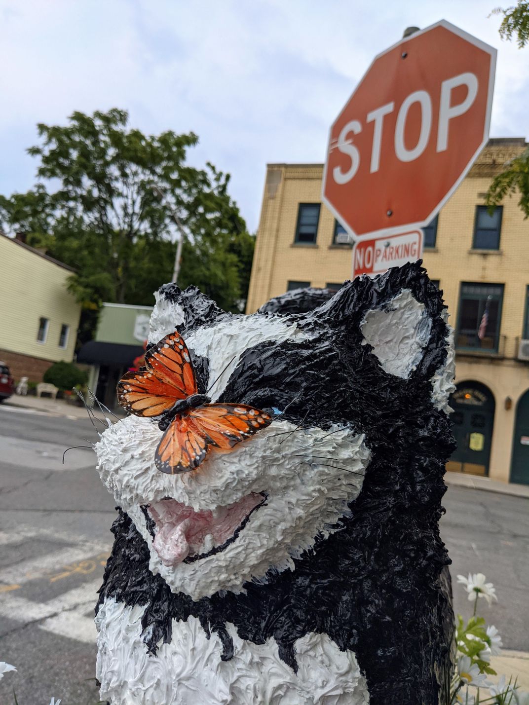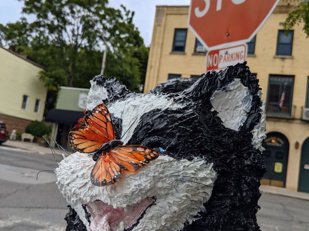 Cat sculptures go up in Catskill, NY and are auctioned after Labor Day in September to raise funds for the town Butterfly ignores the sign and parks itself on the cat’s nose.