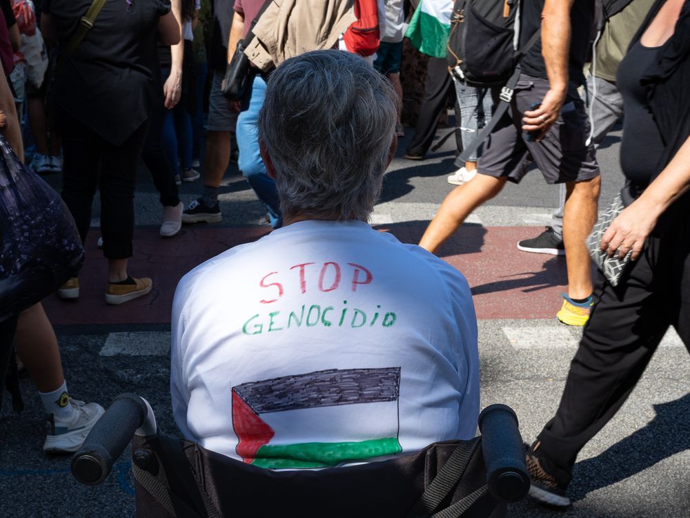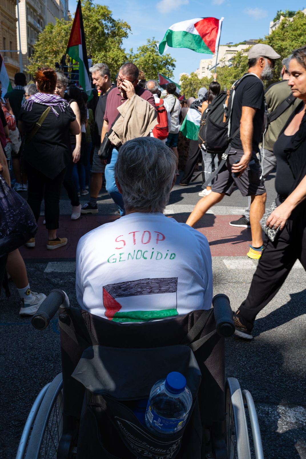 a capture taken during the demonstration against the genocide in Gaza.If the lady in the wheelchair can make an effort to show up, we all can . According to the Guardia Urbana, some 70,000 people, and according to the organizers, 300,000, demonstrated in the center of Barcelona on October 4th to demand an end to the Israeli genocide in Gaza and to show their rejection of the attack on the Global Sumud Flotilla.