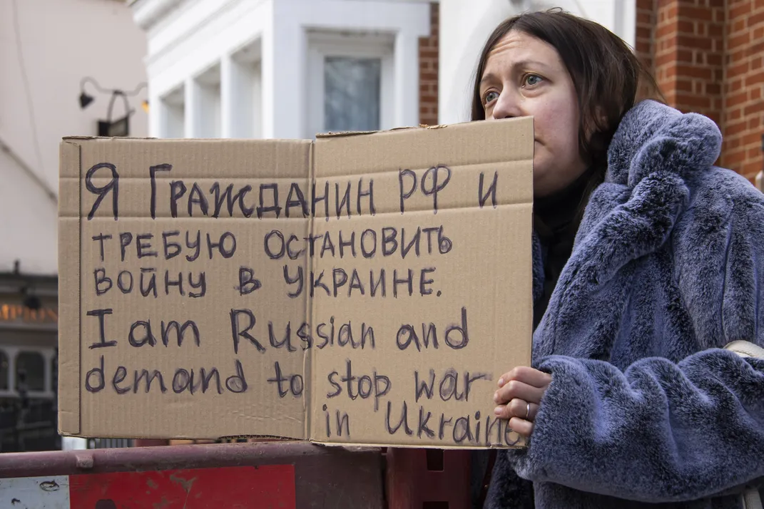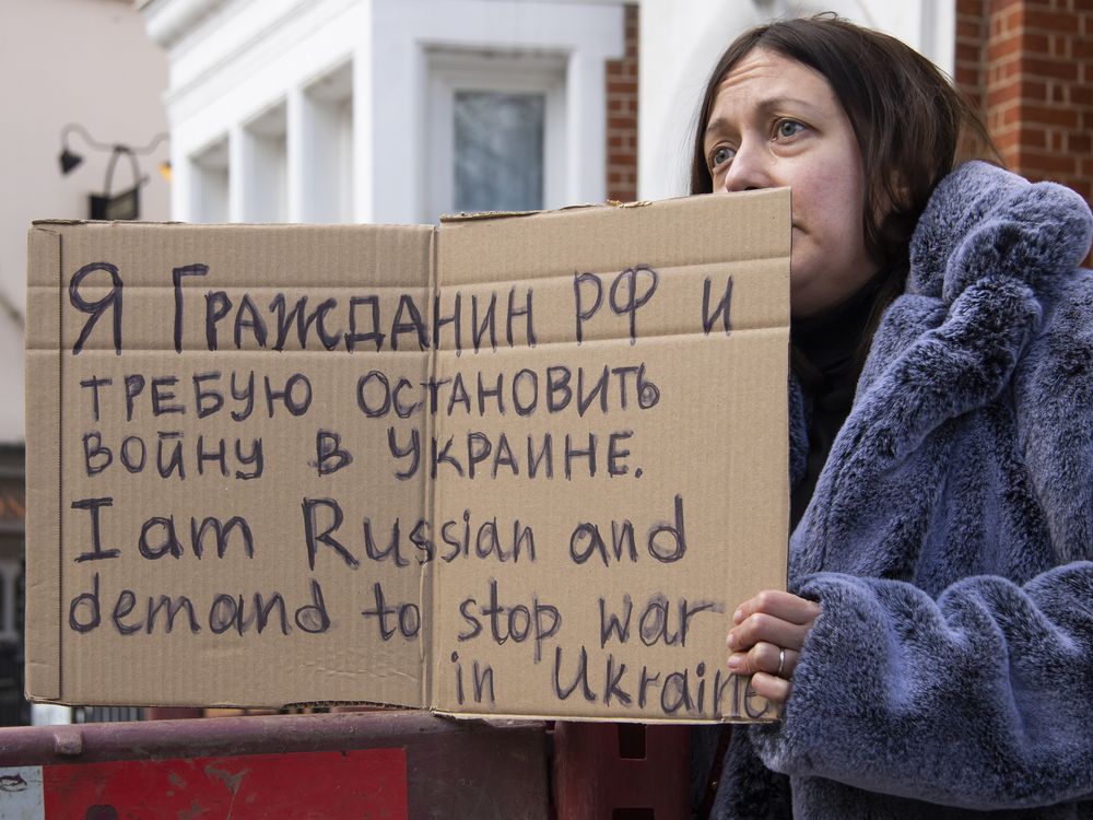 A Russian national protesting the war in Ukraine in the first month of military action.