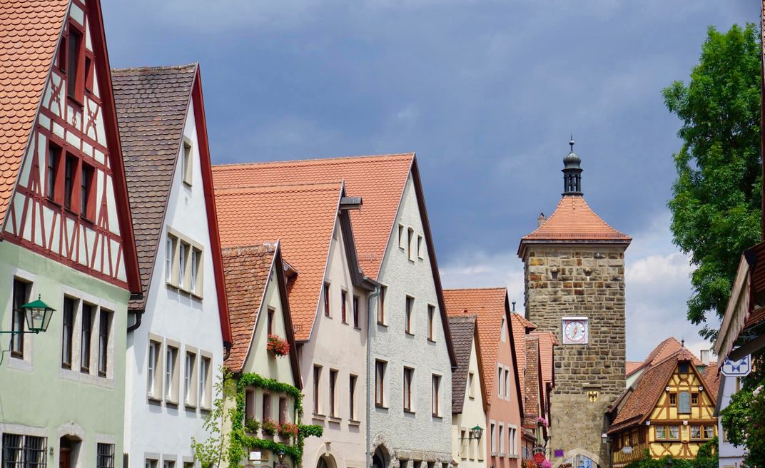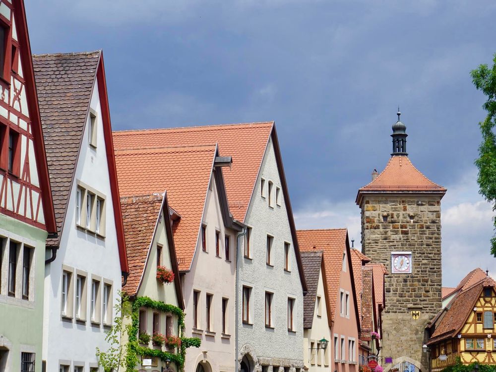 This photo, showcasing some of Rothenburg ob der Tauber's beautiful architecture, was taken on a busy street leading into the center of "Old Town". A storm can be seen in the sky, while the sun reflects the colors on the buildings. The row of buildings lead to the stone wall that surrounds the town.