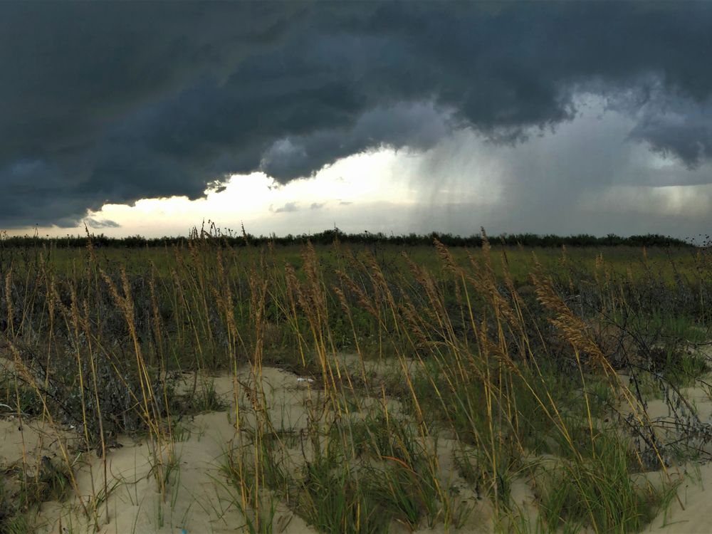 While fishing in the Gulf of Mexico from Matagorda Beach, TX a storm approached our campsite from the North. The incoming cold front blew the storm around us. We stayed dry while watching the rain all around us and out in the Gulf. The wind picked up and blew for 18 hours. When the cold front had blown through the weather had changed from late summer to fall.