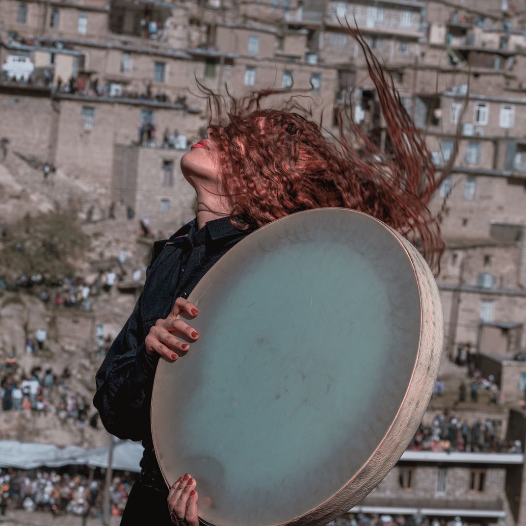 A young woman participating in the Nowruz ‘Hezar Daf’ ceremony in the village of Palangan was playing the daf, completely immersed in her performance, as her hair spun in the air with the movement of her head. In this event, a thousand daf players perform spiritual and local melodies, creating a joyful concert attended by more than 30,000 people in the terraced village of Palangan.
