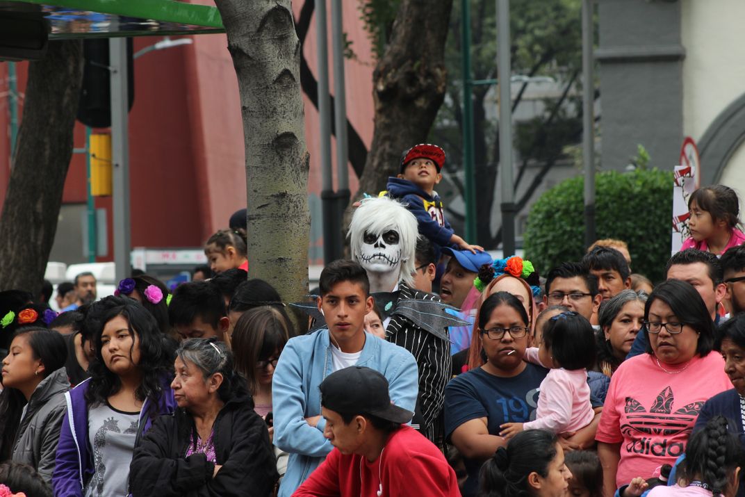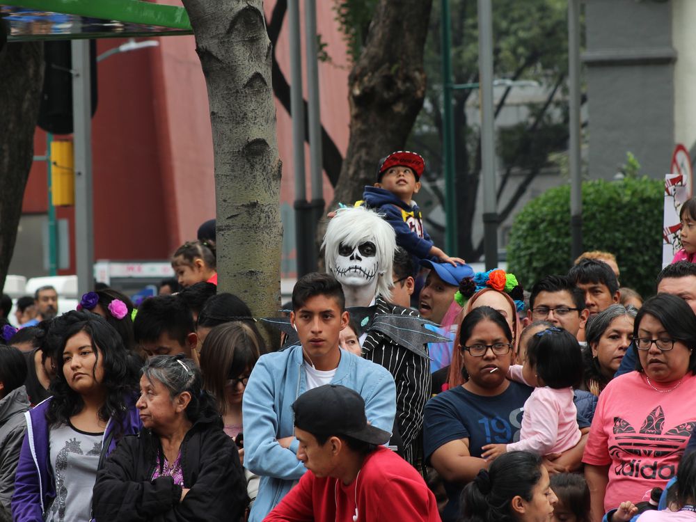 A GUY WITH MAKE UP DEATH, AROUND PEOPLE, IN THE DAY OF DEATH PARADE MEXICO