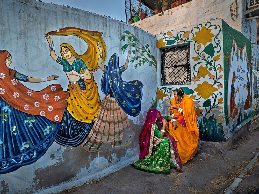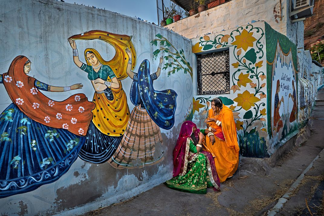 Two women in vibrant traditional attire sit by a mural of dancing figures in a narrow Jodhpur alley. The vivid wall art mirrors their grace, blending daily life with Rajasthani culture.