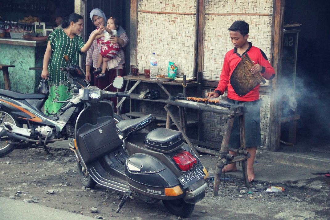 A boy cooking satay on an open grill, vintage Vespa Scooter and two women playing with a baby. It is a scene that happens all over Indonesia.