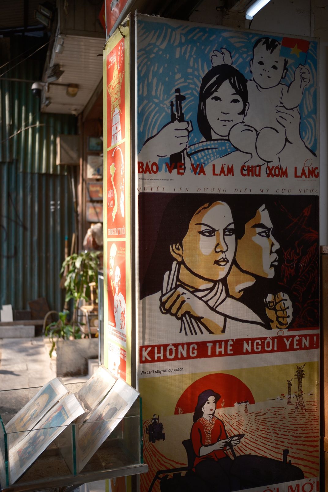 Vintage propaganda posters illuminated by soft golden light, blending historical iconography with the everyday rhythms of the city.