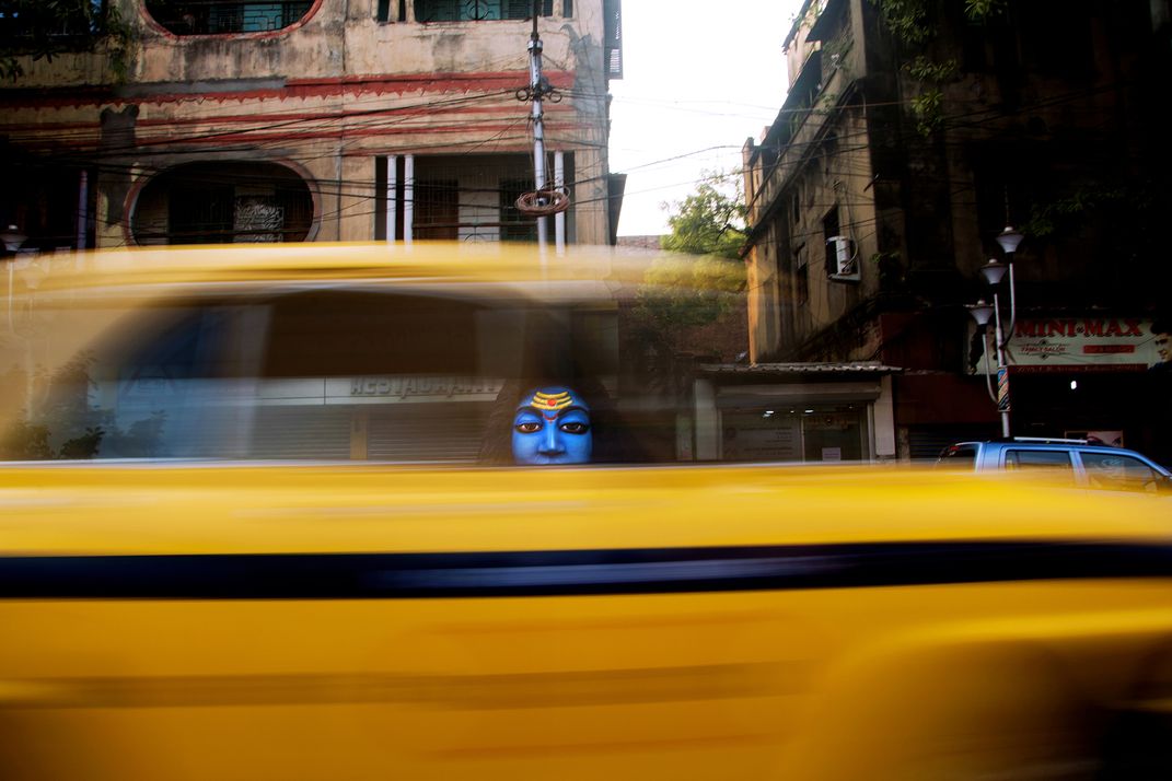 The idol of Lord Shiva was on the side of a street near Kumortuli, Kolkata. I used slow shutter speed to capture the idol's face through the window of a running vehicle. An iconic yellow taxi of Kolkata gave me the right opportunity to click my shot.