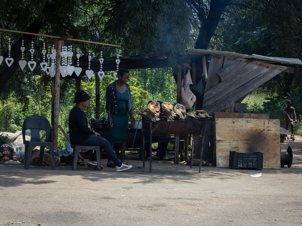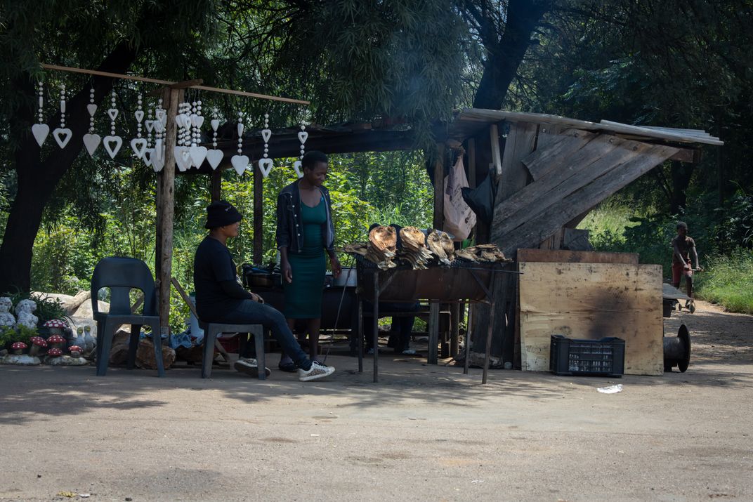 A roadside food stall in Hartbeespoort, South Africa. Locals grill meat under handmade decorations, capturing the warmth, rhythm, and resilience of daily life in the African sun.