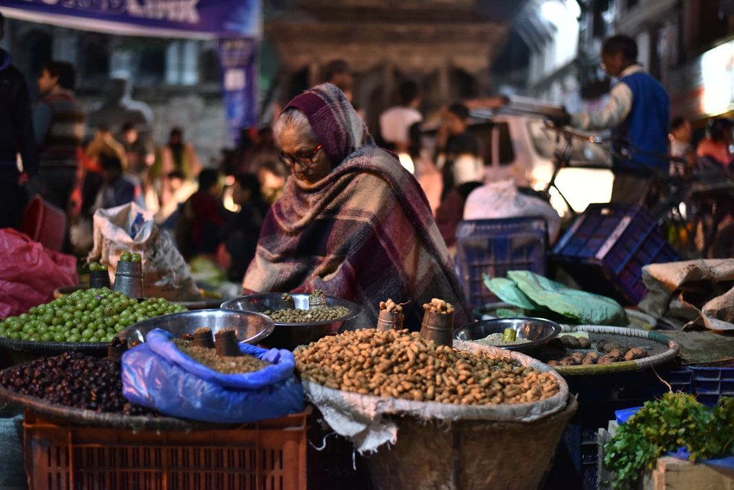 The Kathmandu Durbar Square in Basantapur is a hub of colorful street vendors at night. This lady was selling peanuts and gooseberry.