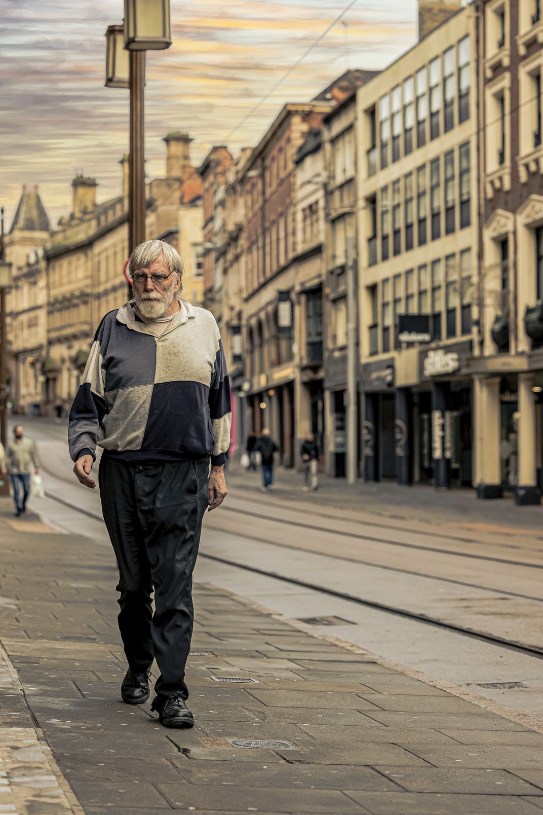 On the streets of Nottingham after the rain, an old man is taking a leisurely stroll, and he seems to be at one with the city.