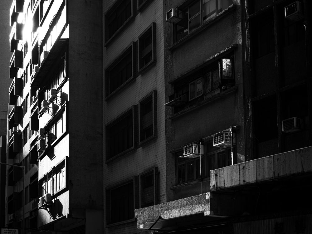 A lone man is strolling through the streets of Hong Kong. Walking towards the setting sun and illuminated by the light of the late afternoon sun, his silhouette stands out against the monochromatic background of the towering buildings, as the man continues his journey through the empty street.