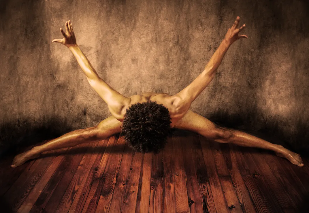 A contemporary dancer captured mid-stretch, embodying the tension between control and release. The image explores the human form as both sculpture and movement, emphasizing strength, balance, and vulnerability.