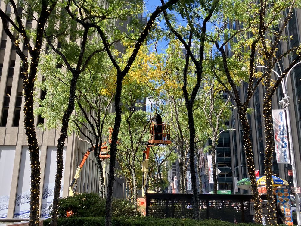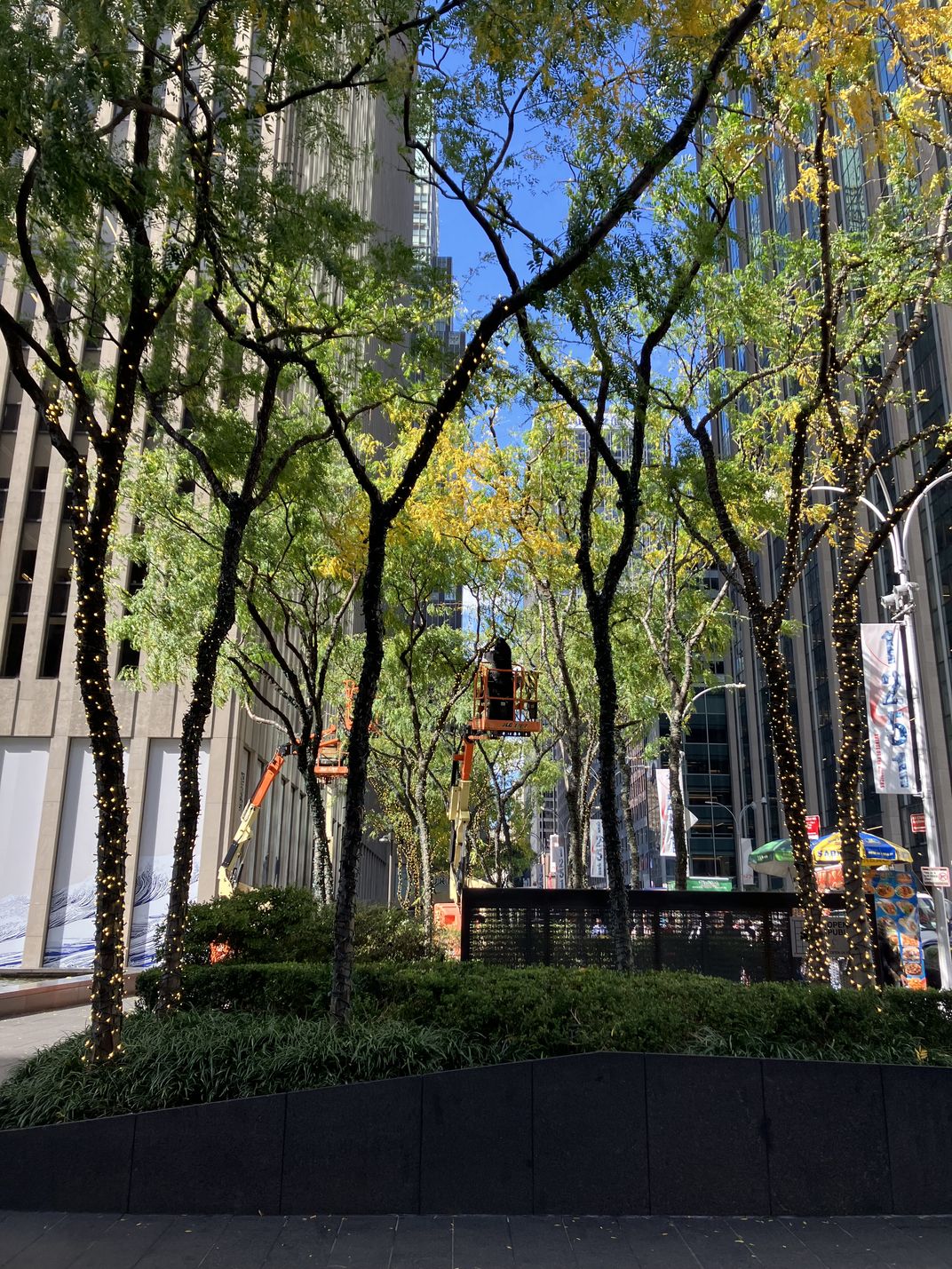 Workers string lights in the trees in midtown Manhattan, which marks the start of the holiday season.