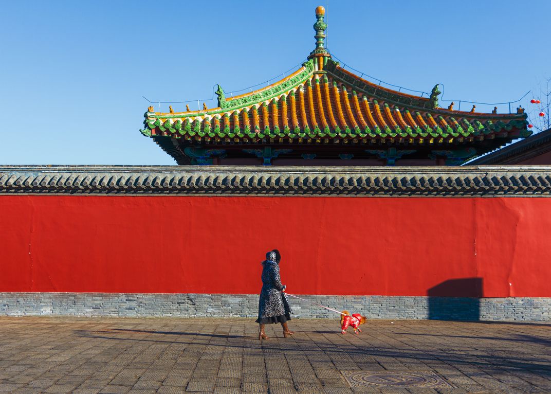 The photo was taken on March 3, 2024, at the Shenyang Palace Museum. Under the warm sunshine, a fashionably dressed woman was leisurely strolling outside the red walls of the palace, holding a pet dog dressed in red.