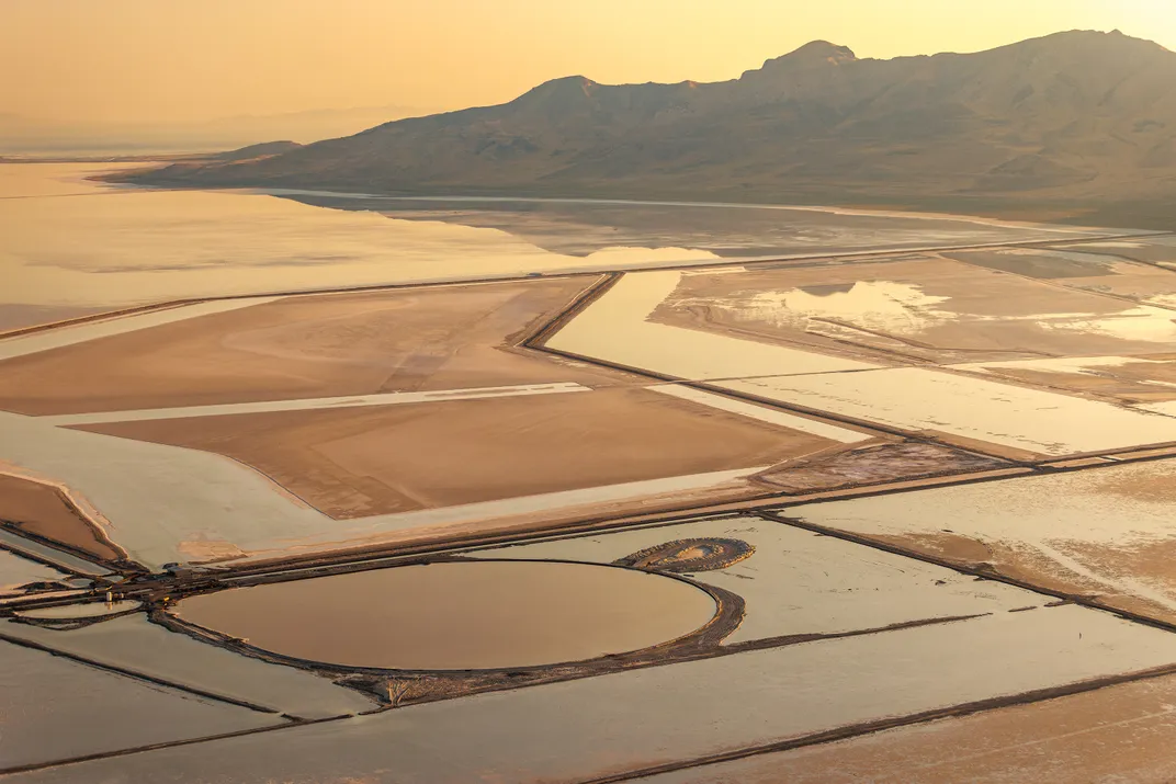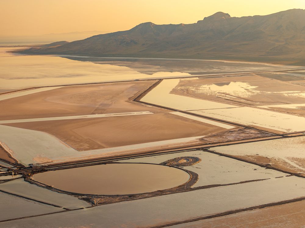 Industrial evaporation ponds stretch across the southern shore of the Great Salt Lake, their geometric boundaries dividing a wetland that once shifted freely. Decades of water diversions and mineral extraction have lowered the lake to historic levels, concentrating its brine and exposing vast areas of lakebed to dust and salt. Photographed from a small aircraft, the scene shows how the lake’s natural rhythms have been replaced by engineered lines—the visible imprint of declining water levels and the mounting pressure on one of North America’s most important saline ecosystems.