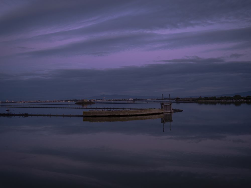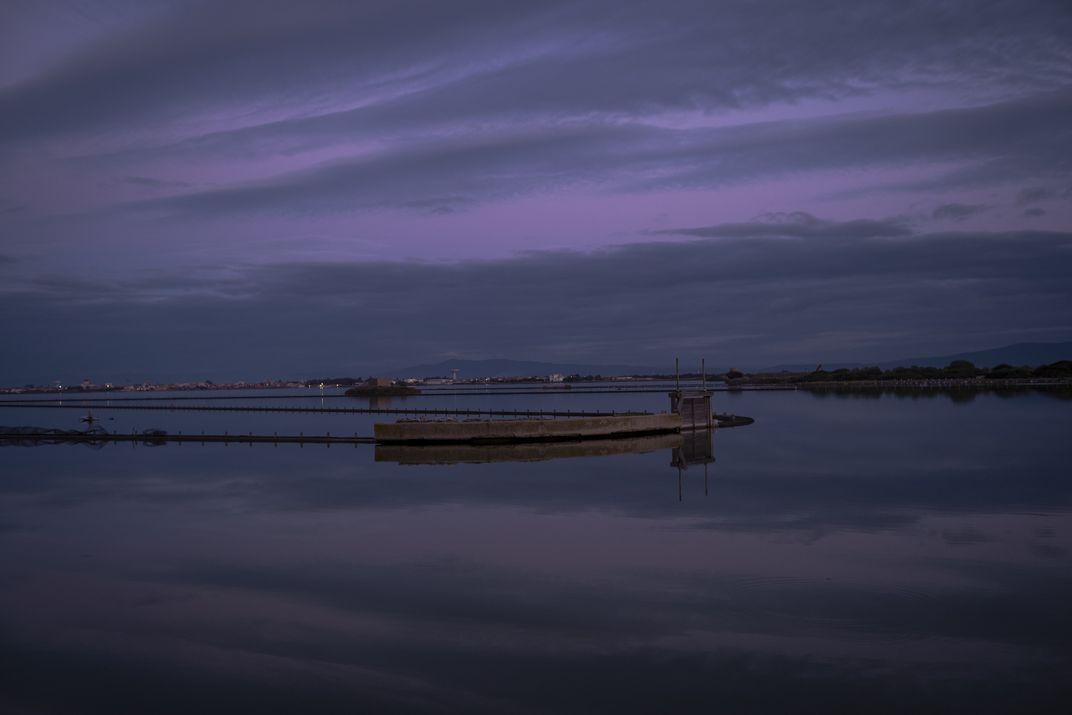 As night falls in Cabras, Sadinia, the day's last light reflecting on Cabras Lagoon makes an almost abstract tonal study of the color blue