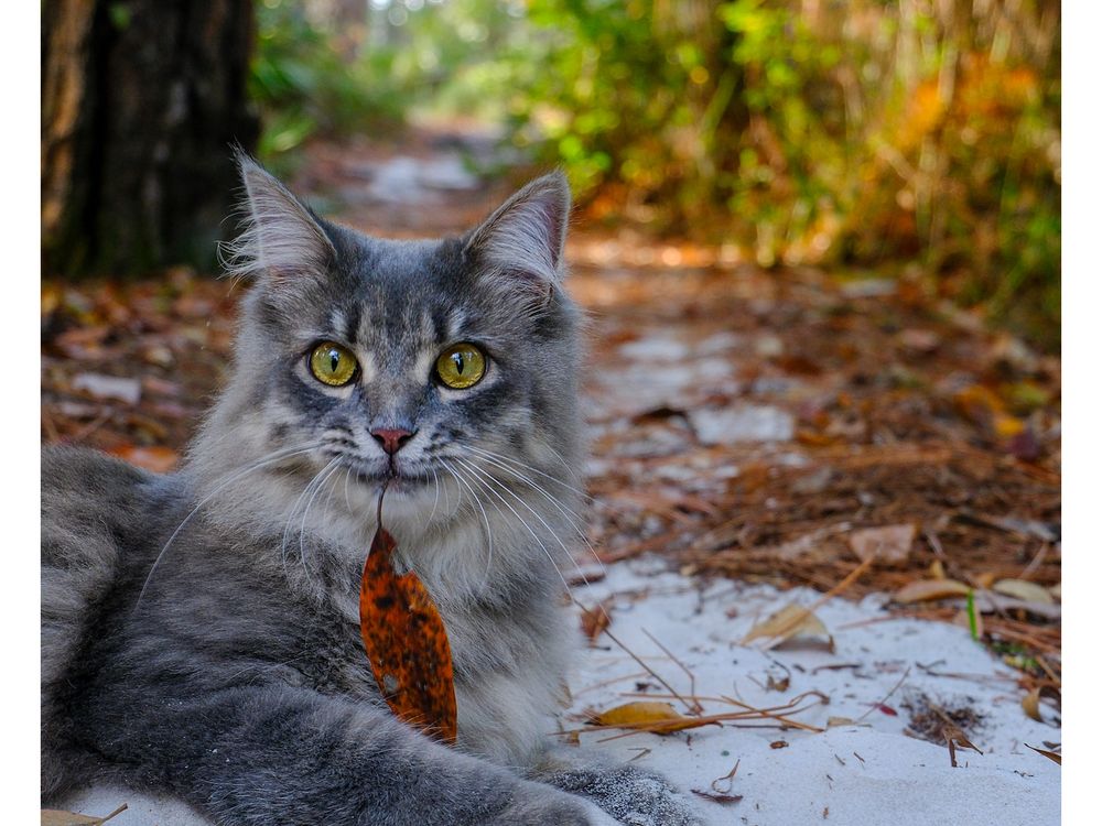 Stunning Grey cat holds a leaf in it’s mouth, located in a picturesque Florida forest.