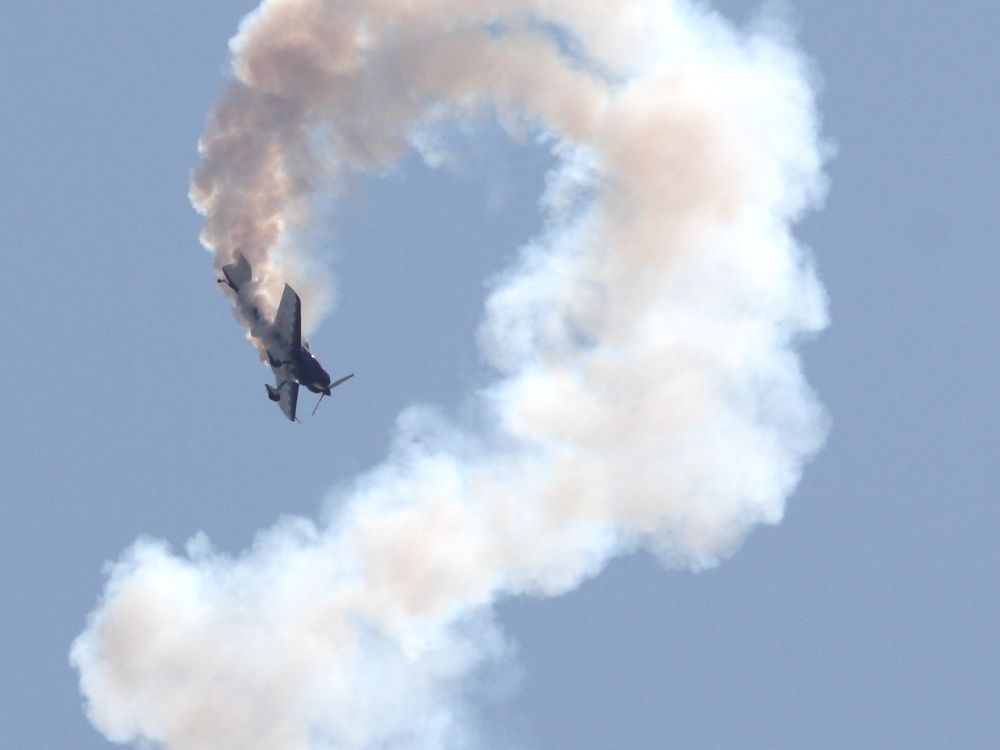 Stunt plane performs an a low altitude inversion.
