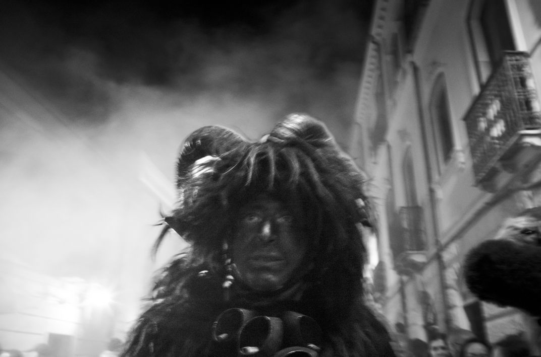 The traditional celebration of Halloween in Sardinia is rooted in prehistoric rituals that have been maintained on the island for millennia. In the village of Seui it's called Su Prugadoriu, meaning "purgatory." Men dress in animal skins and horns, darken their faces, and perform ceremonies around bonfires. These revelers are in Seui, one of the remote mountain villages where the old traditions live on.