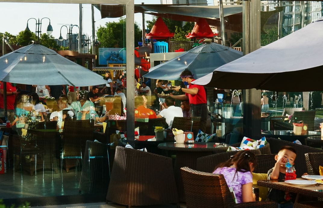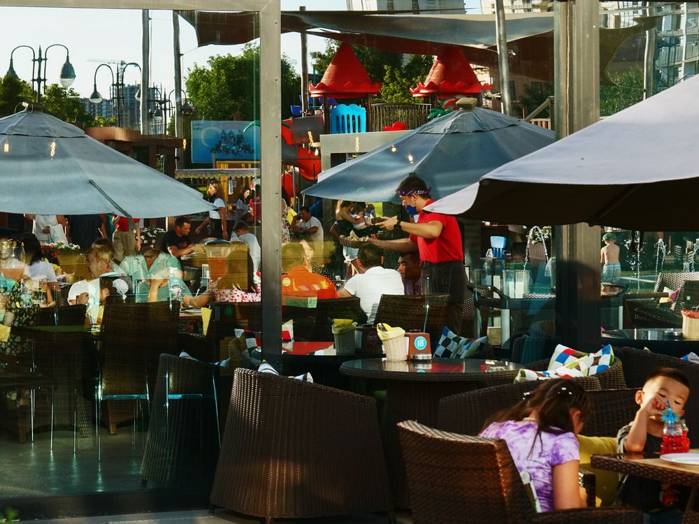The atmosphere in the summer cafe where there are many visitors fascinates with its beauty.