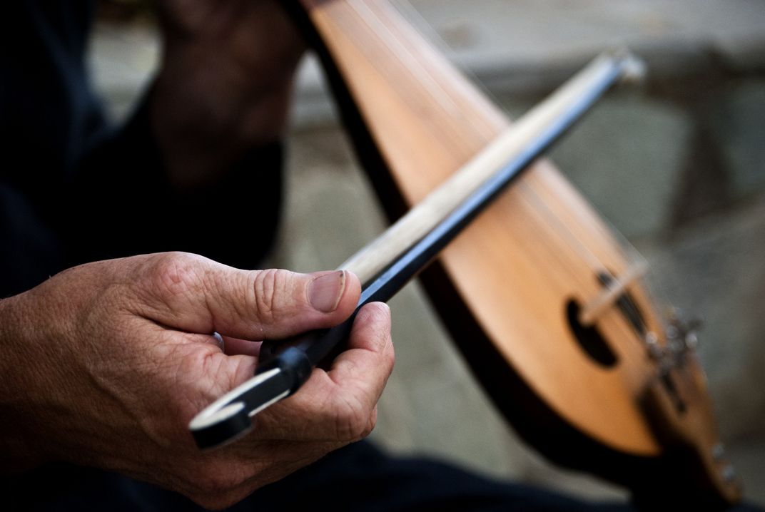 This photo was taken in a village called Meronas, located in south Rethymno, Crete. For the past four years musicians of traditional instruments teach for a week lyre, brass instruments, lute and mandolin and at the end of the week the perform all together as the whole village gathers for a feast.