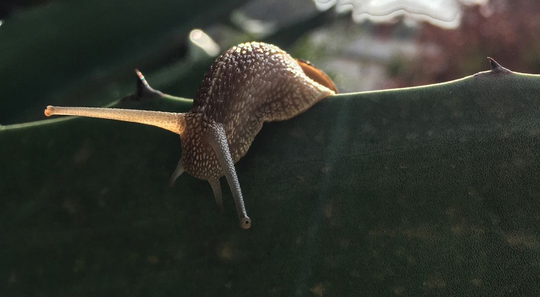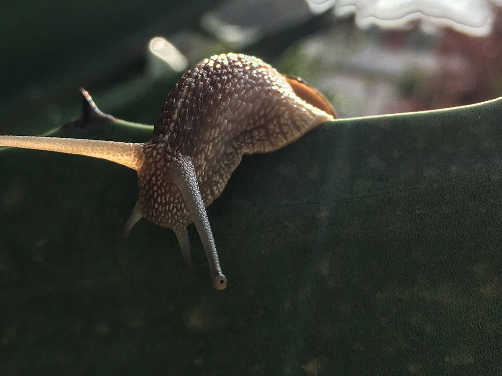 a snail walking quietly in a agave