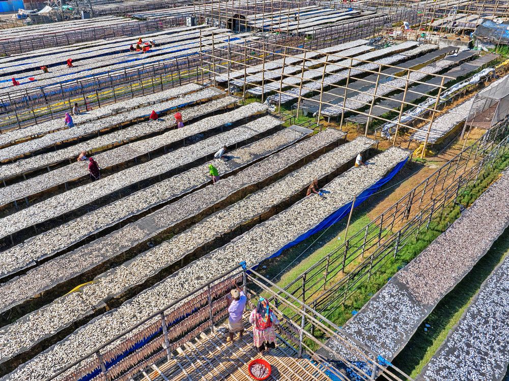 In the heart of the fishing community, fish are meticulously laid out under the sun to dry, a process known as "shutki polli." The scene captures the hardworking spirit of the people as they prepare dried fish, a staple of local cuisine and a time-honored tradition.
